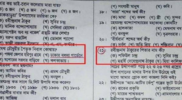 নিউজ ডেস্ক : রাজধানীর রামকৃষ্ণ মিশন উচ্চ বিদ্যালয়ে পরীক্ষায় নবম শ্রেণির বাংলা প্রথম পত্রের বহু নির্বাচনি প্রশ্নে জানতে চাওয়া হয়েছে, বিশ্বকবি রবীন্দ্রনাথ ঠাকুরের পিতার নাম কী? এই প্রশ্নের সম্ভাব্য যে