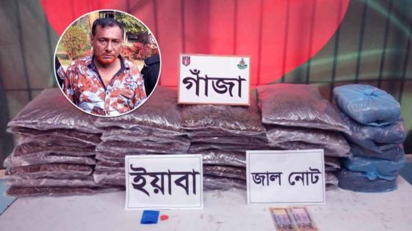 কিশোরগঞ্জ জেলা শহরের নগুয়া বটতলা মোড় এলাকা থেকে ৩৭ কেজি গাঁজা, ২০ পিস ইয়াবা ও ২ হাজার টাকার জাল নোট’সহ মাদকের গডফাদার কাজল (৪৫) কে আটক করেছে র্যাব-১৪, কিশোরগঞ্জ ক্যাম্প।