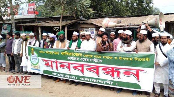 কিশোরগঞ্জের হোসেনপুরে আহম্মদ কবিরাজের মেলার নামে সমাজ বিরোধী ও ইসলাম বিরোধী কার্যক্রম, মদ, জুয়া, গাাঁজা ও ইয়াবাসহ বিভিন্ন অনৈতিক কার্মকান্ড বন্ধের দাবিতে আলেম সমাজ ও এলাকাবাসী মানববন্ধন করে সংশ্লিষ্ট উর্ধ্বতন